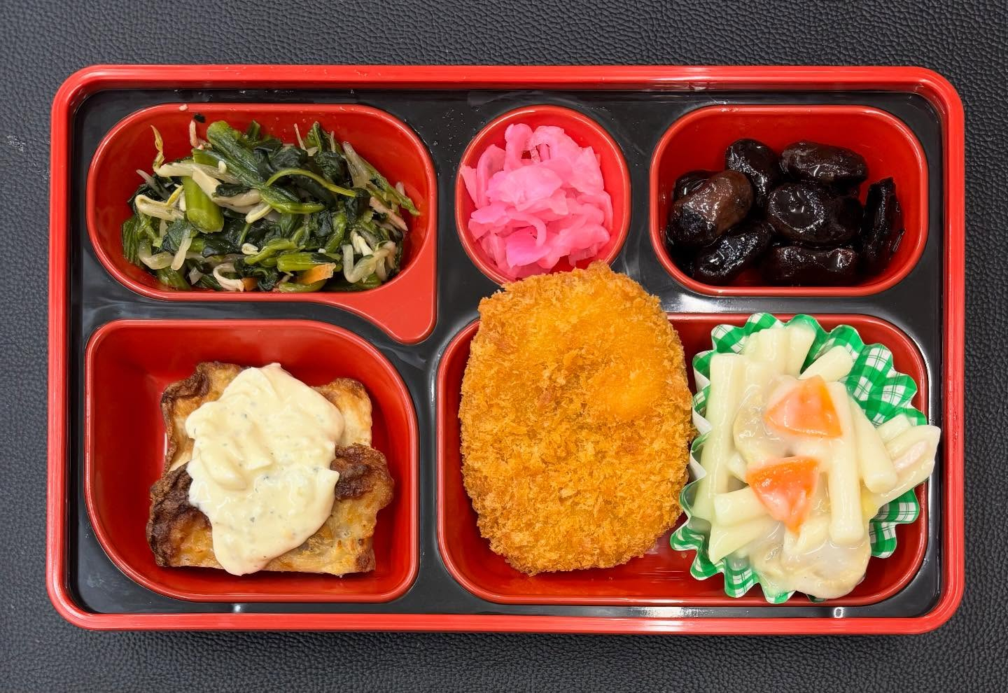 12月18日 今日の日替り弁当は12月18日 今日の日替り弁当は 肉じゃがコロッケ グリルチキンのタルタルソース マカロニクリーム煮 黒花豆甘煮 五目ひたし です!