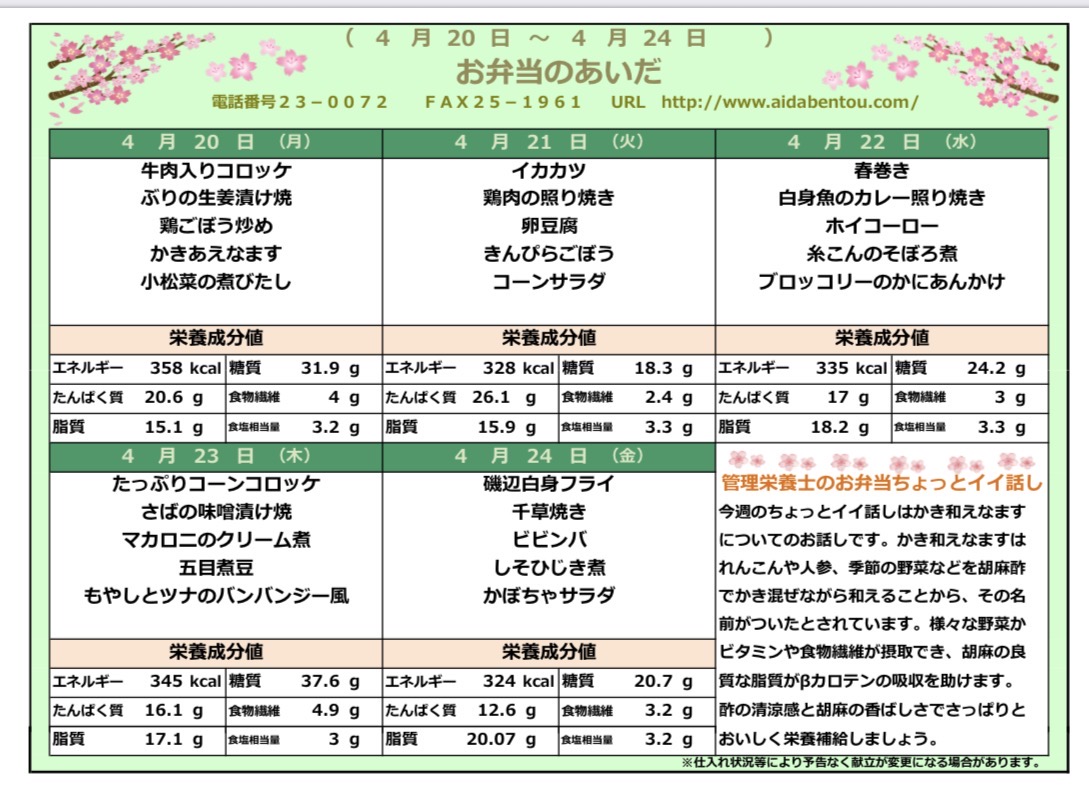 4月13日からのメニュー4月13日からのメニュー 配食サービス