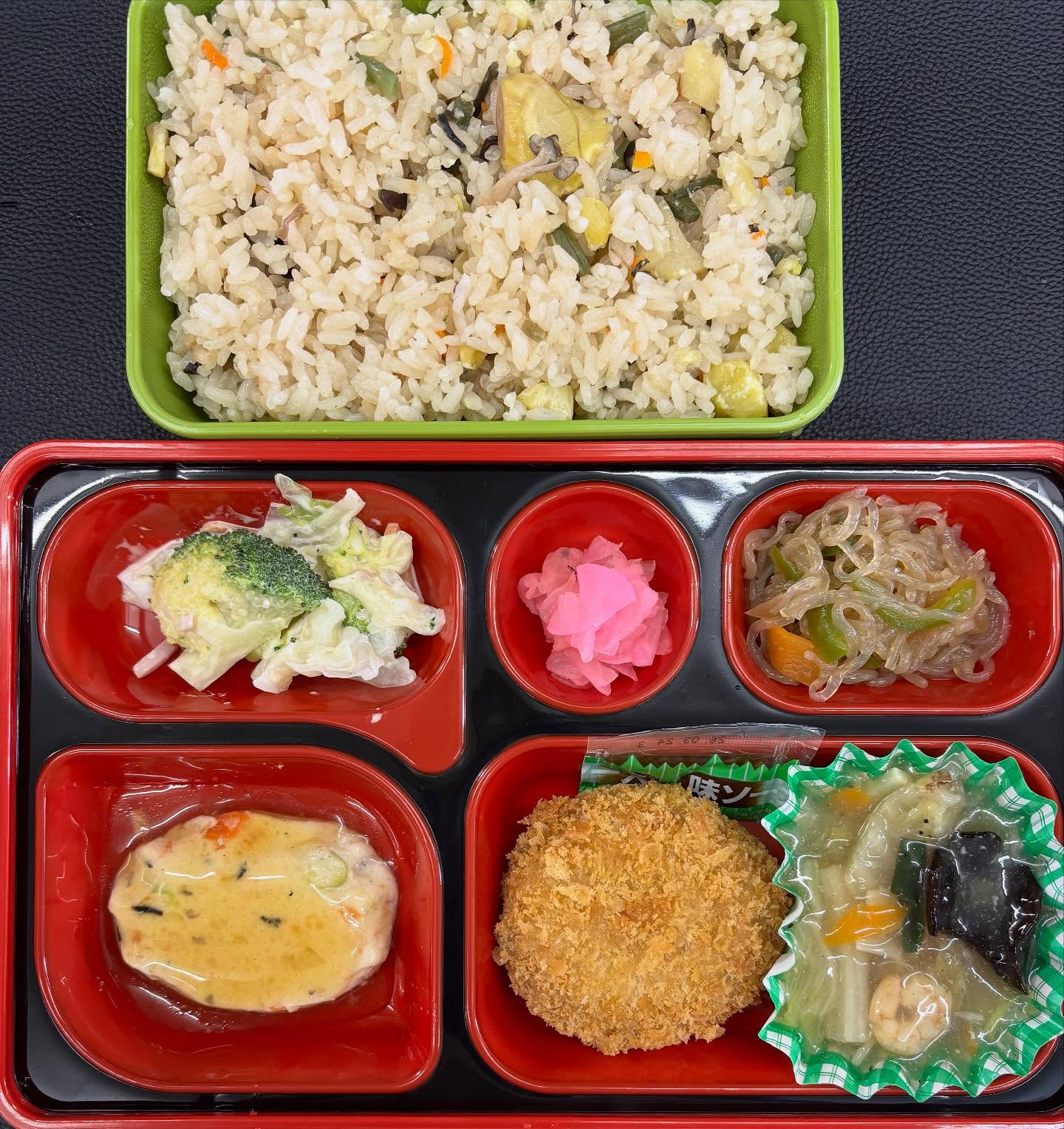 10月23日 今日の日替り弁当は10月23日 今日の日替り弁当は かにクリームコロッケ 豆腐ハンバーグ 八宝菜 糸コンのチャプチェ風 ミモザサラダ 栗ご飯 です!